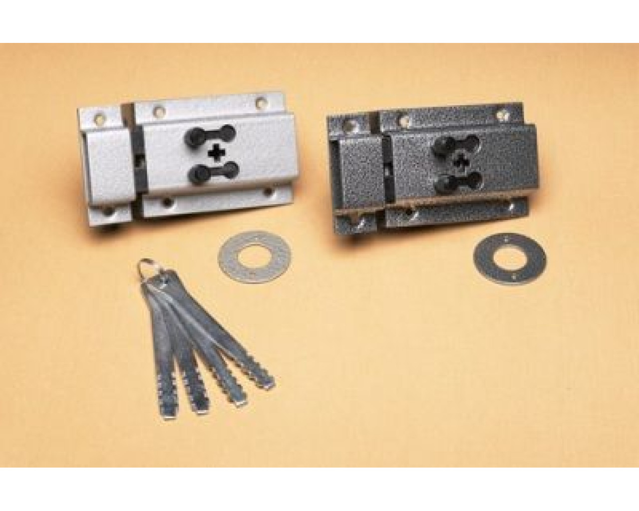 Замок накладной реечный. Предназначен для установки на различные двери. Два прямоугольных ригеля размерами 14х14 мм, с максимальным вылетом 22 мм. Удаление ключевого отверстия - 42 мм. Габариты замка - 92х68х59 мм. Комплектация - 4 ключа, запорная планка. Закрывание и открывание замка изнутри производится ручкой, снаружи ключом. Замок открывается на обратном ходе ключа, что повышает его секретозащищенность. Имеет ручную фиксацию ригелей в открытом и закрытом положениях