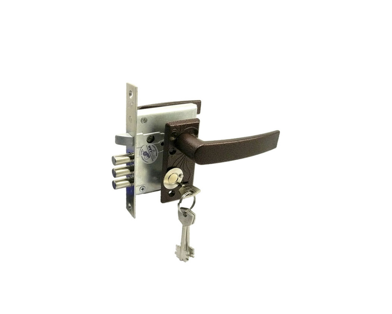 Замок врезной с ручками, 8-и сувальдный. Предназначен для установки в деревянные двери толщиной 40-50мм, правого и левого открывания. Дверь может быть закрыта на защелку и открыта с помощью фалевой ручки при открытом засове замка. Три цилиндрических ригеля, диаметром 12мм. Вылет засова 21мм. Стальной, оцинкованный корпус. Межосевое расстояние 55мм. Удаление ключевого отверстия 50мм. Заявленная секретность 250 000 кодовых комбинаций. Комплектация: литые накладки с фалевыми ручками, 3 ключа.