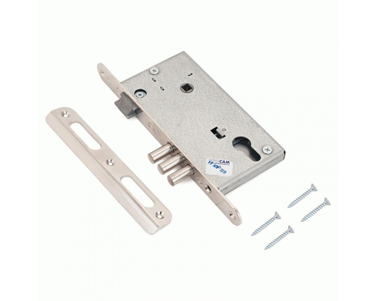 Замок врезной цилиндровый с защелкой . Предназначен для входных и внутренних дверей толщиной 40-50 мм жилых домов, квартир, торговых и конторских помещений. Замок универсальный, его можно устанавливать как в правые, так и в левые двери, переустановив защелку. Межцентровое расстояние 85 мм.Комплектуется 3/5 стальными ключами. Изготавливается с засовом из трех стальных стержней круглого сечения. Покрытие корпуса — цинковое. Покрытие лицевой и ответной планок — никелевое.