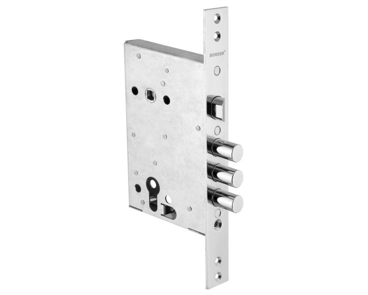 Замок врезной для установки в металлические двери, с защелкой. Без ответки, без цилиндрового механизма. Покрытие лицевой планки и ригелей хром Характеристики : - габаритные размеры - 100*156,5 - количество ригелей - 3 - диаметр ригелей - 15,8мм - вылет ригеля - 22.8мм - бэксет (Backset) - 65 мм - межосевое расстояние - 85мм - упаковка - пакет