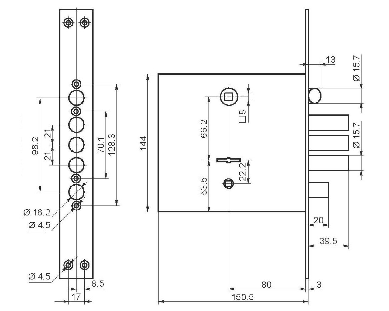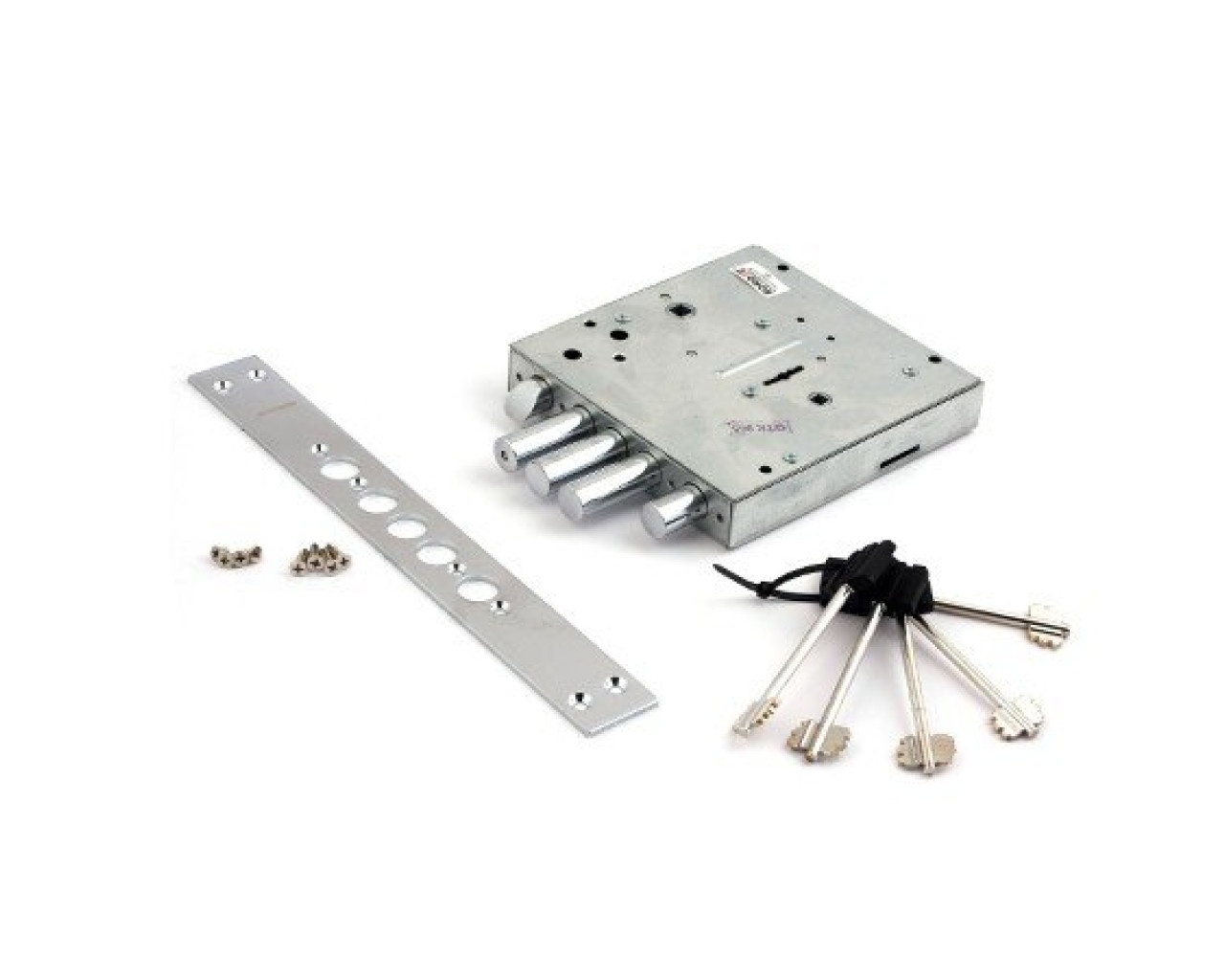 Замок врезной сувальдный с защелкой и задвижкой. Предназначен для металлических дверей. Замок имеет засов из трех цилиндрических ригелей диаметром 15,7 мм, с максимальным вылетом 39,5 мм, и универсальную защелку диаметром 15,7 мм. Вылет задвижки - 20 мм. Удаление ключевого отверстия 80 мм. Межосевое расстояние 66,2мм. Габариты замка - 150х144х28мм. Комплектация - 5 ключей, . В одном из ригелей расположен закаленный стальной стержень, обеспечивающий надежную защиту от перепиливания.