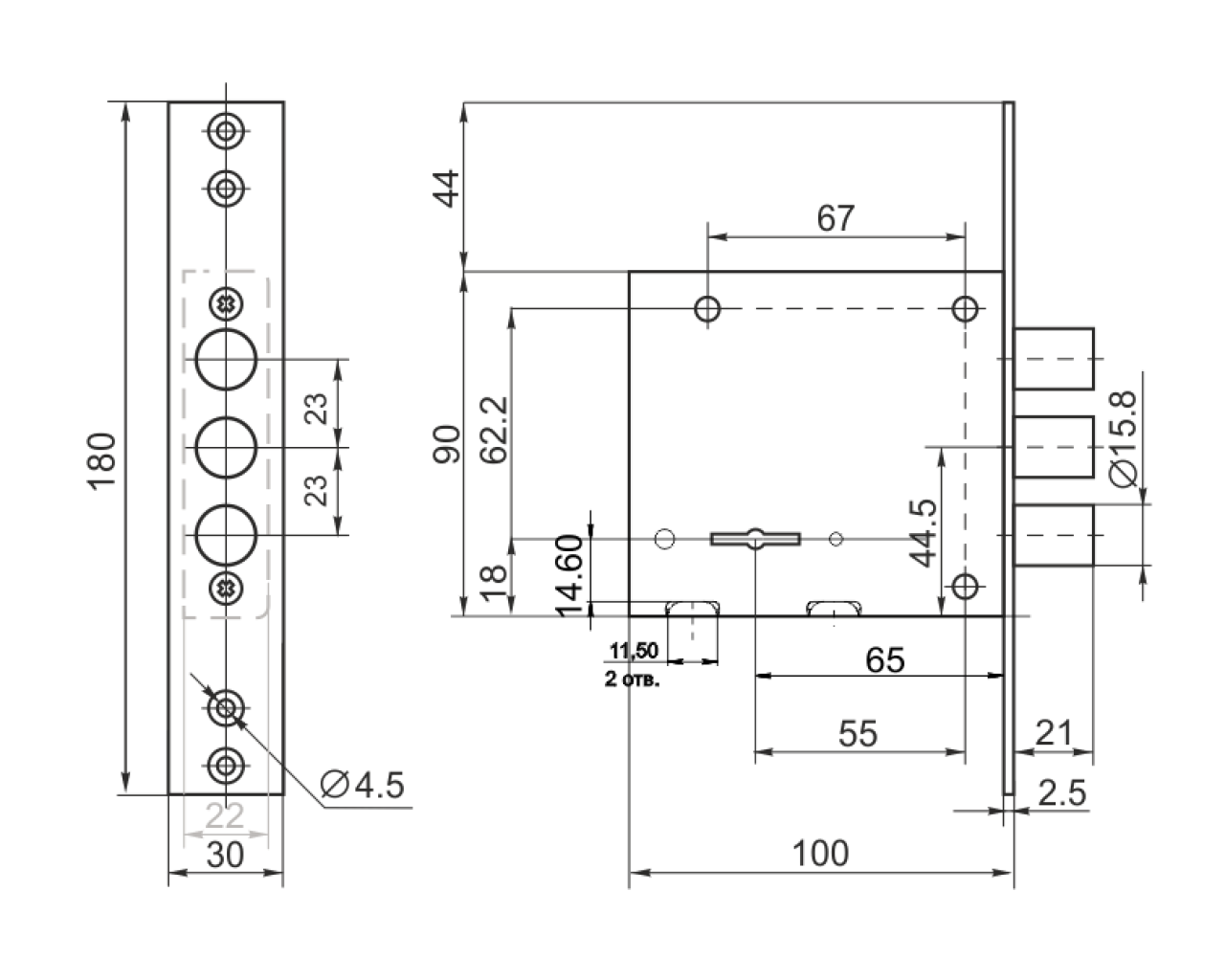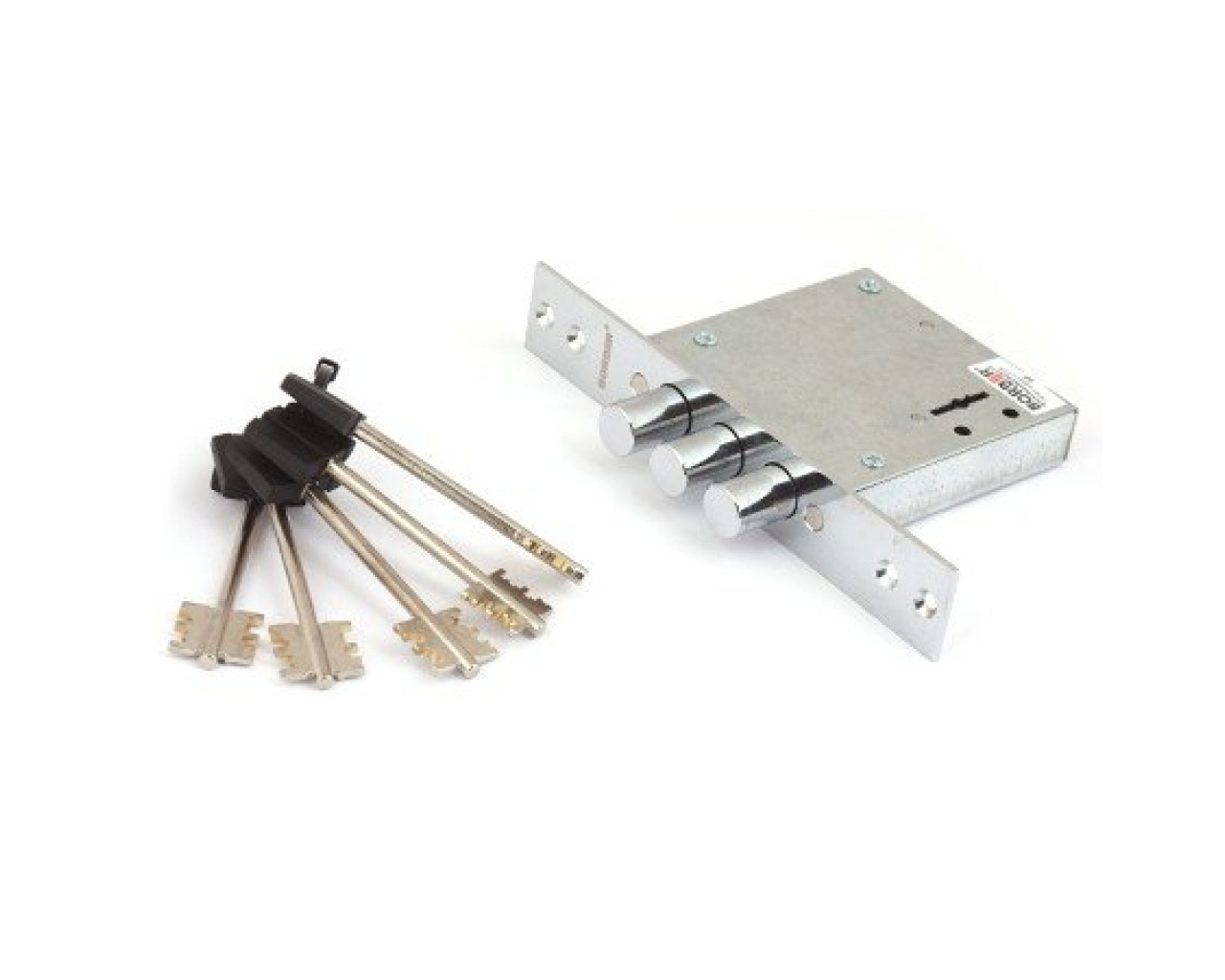 Тип замка - врезной Модель замка - универсальный Тип механизма секретности - сувальдный Количество сувальд - 8 Количество комбинаций - 250 000 Задвижка - нет Защелка - нет Тяги - нет Количество ригелей - 3 шт. Вылет ригелей - 21 мм Диаметр ригелей - 15,8 мм Длина ключа - 97 мм Количество ключей - 5 шт. Бэксет - 65 мм