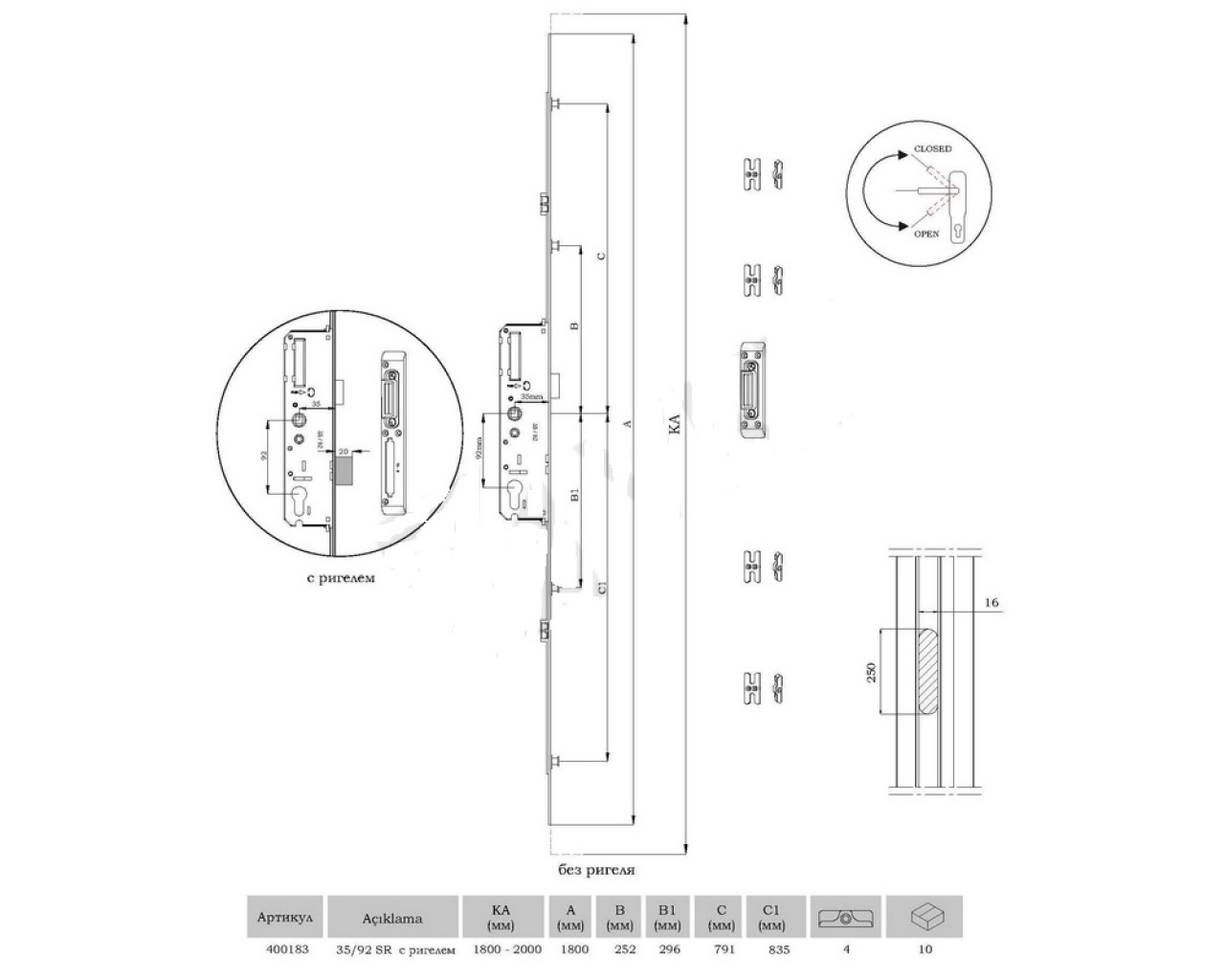 Привод замка от ручкиШтульп 16 ммДлина 1800 мм без возможности удлиненияДорнмас 35 мм4 регулируемые роликовые цапфыВ качестве ответных планок используются любые стандартные оконные для цапфШтифт сечением 8 мм для стандартного нажимного гарнитураРигельный засов выдвигается на 15 ммФалевая защлка замка переворачивается для правых и левых дверейЗакрытый корпус замка защищает механизм от внешних воздействийШтульп замка никелированныйРигель и фалевая защлка металлические хромированныеВозможность использовать стандартный евроцилиндрМежосевое расстояние 92 мм