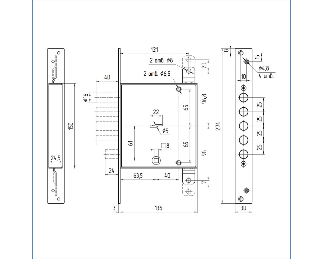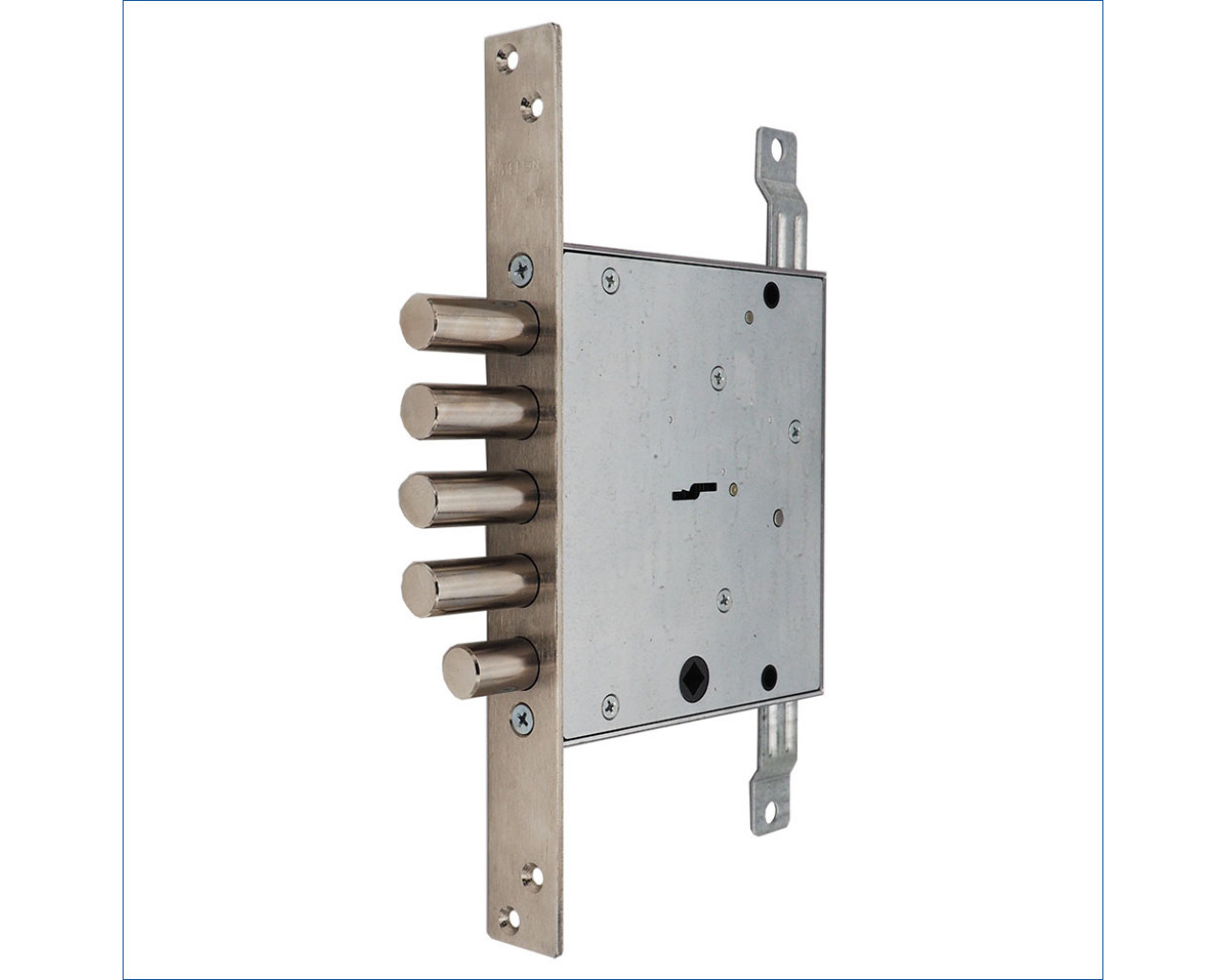 Замок врезной сувальдный с тягами и задвижкой. Предназначен для металлических дверей. Замок имеет засов из четырех цилиндрических ригелей из никелированной стали диаметром 16 мм, с максимальным вылетом 40 мм. Вылет задвижки 24мм, тяг - 22мм. Удаление ключевого отверстия 66мм. Количество оборотов ключа – 4. Габариты замка - 136х149х30мм. Комплектация - 5 ключей, ручка поворотная, две декоративные накладки из нержавеющей стали, съемная лицевая планка. В одном из ригелей расположен закаленный стальной стержень, обеспечивающий надежную защиту от перепиливания.