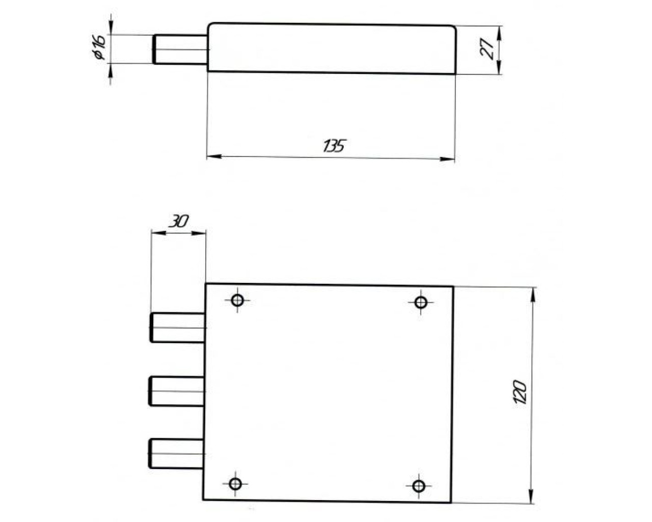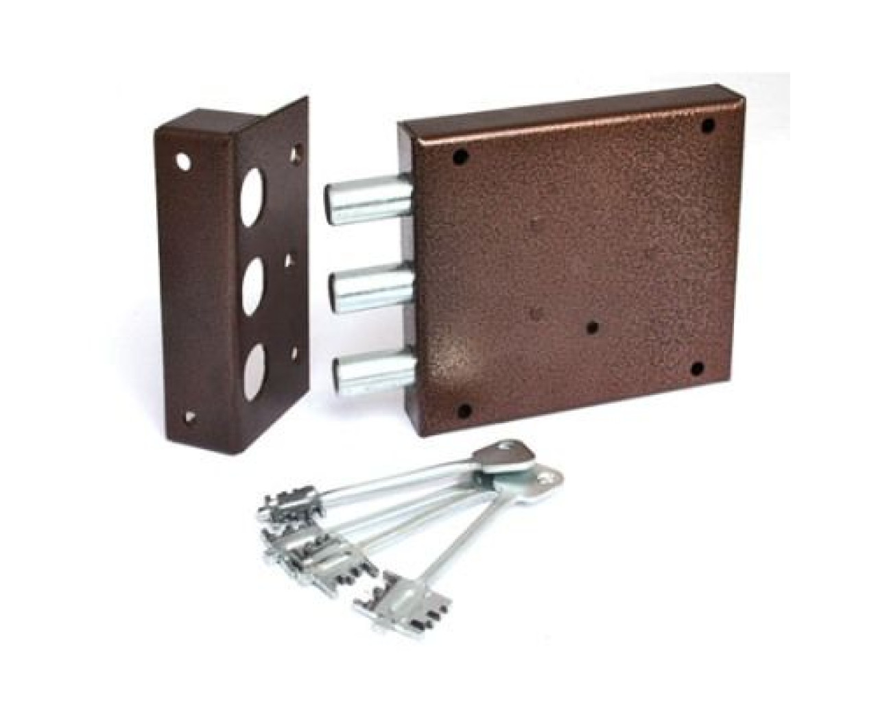Замок накладной сувальдный. Предназначен для установки на металлические двери. Засов из трех цилиндрических ригелей диаметром 16 мм, с максимальным вылетом 30 мм. Удаление ключевого отверстия - 70 мм. Габариты замка - 135х120х27 мм. Комплектация - 4 ключа, запорная коробка.
