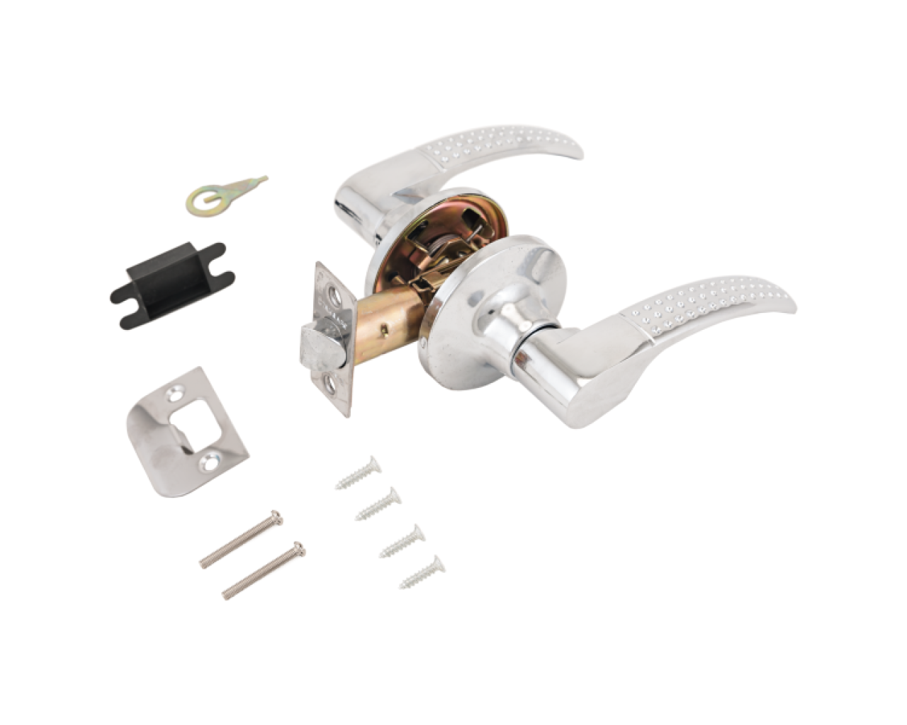 Ручка-защелка фалевая, нажимная для межкомнатных дверей . Материал ручек - алюминиевый сплав, накладок- сталь. Гальваническое покрытие. Предназначена для дверей толщиной до 40 мм. Регулируемое расстояние от края двери до оси ручек 60-70 мм. Скругленная защелка размерами 14х19 мм с вылетом 12 мм. Габариты корпуса врезной защелки 85х23х20 мм.